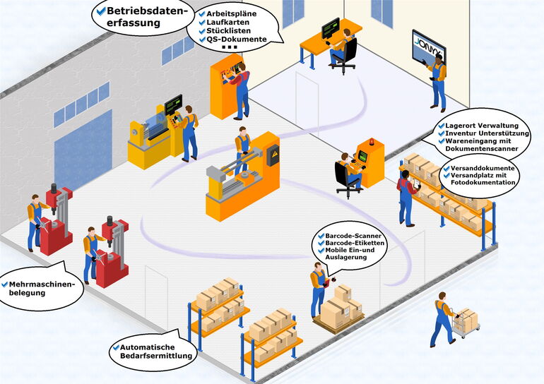 Neben klassischer Produktions- und Fertigungsplanung deckt sie auch Bereiche wie eine Betriebsdatenerfassung (BDE), Personalzeiterfassung (PZE), Customer-Relationship-Management (CRM) und eine Dokumentenverwaltung ab.